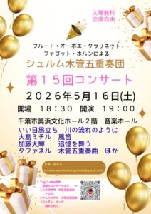 千葉県で開催予定のコンサート・イベント情報【毎日更新】 千葉県で明日以降に開催されるライブ・コンサート・音楽フェス情報を毎日更新しています。 気になる千葉県で開催予定のコンサート・イベントをぜひチェックしてください。 千葉県で開催されるコンサート・イベント情報 八千代フェスティバルバンド 第15回スペシャルコンサート(吹奏楽) 日時: 2026-02-15 14:00 会場: 八千代市市民会館大ホール エリア: 千葉県 詳細を見る アンサンブル・ココペリ 第16回 スプリングコンサート 日時: 2026-03-08 13:00 会場: さわやかちば県民プラザ 住所: 千葉県柏市柏の葉4丁目3-1 エリア: 千葉県 詳細を見る 市民吹奏楽団チバウィンド第37回定期演奏会 日時: 2026-03-08 13:30 会場: 千葉市民会館 大ホール エリア: 千葉県 詳細を見る ミュージカル夜空の虹 日時: 2026-03-22 13:00 会場: 行徳文化ホールI&I 住所: 千葉県市川市末広1-1-48 エリア: 千葉県 詳細を見る 船橋ジュニアオーケストラ スプリングコンサート2026 日時: 2026-03-30 17:30 会場: 八千代市市民会館 大ホール 住所: 八千代市萱田町728 エリア: 千葉県 詳細を見る 幕張フィルハーモニー管弦楽団 日時: 2026-04-26 14:00 会場: 千葉市民会館 大ホール 住所: 千葉県千葉市中央区要町1-1 エリア: 千葉県 詳細を見る シュルム木管五重奏団 第15回コンサート 日時: 2026-05-16 19:00 会場: 千葉市 住所: 千葉市美浜区真砂5-15-2 エリア: 千葉県 詳細を見る 他のエリアのイベント 仙台市で開催予定のコンサート・イベント情報【毎日更新】 千葉県で開催予定のコンサート・イベント情報【毎日更新】 埼玉県で開催予定のコンサート・イベント情報【毎日更新】 大阪府で開催予定のコンサート・イベント情報【毎日更新】 愛知県で開催予定のコンサート・イベント情報【毎日更新】 札幌市で開催予定のコンサート・イベント情報【毎日更新】 東京都で開催予定のコンサート・イベント情報【毎日更新】 神奈川県で開催予定のコンサート・イベント情報【毎日更新】 福岡県で開催予定のコンサート・イベント情報【毎日更新】