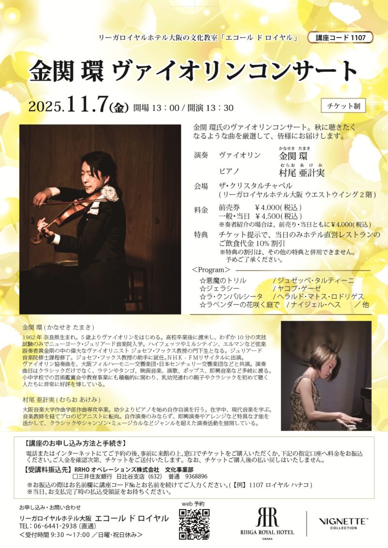 金関 環氏のヴァイオリンコンサート。秋に聴きたくなるような曲を皆様にお届けします。楽しいトークもお楽しみいただきながら、チャペルに響くヴァイオリンとピアノの美しい音色をお楽しみください。