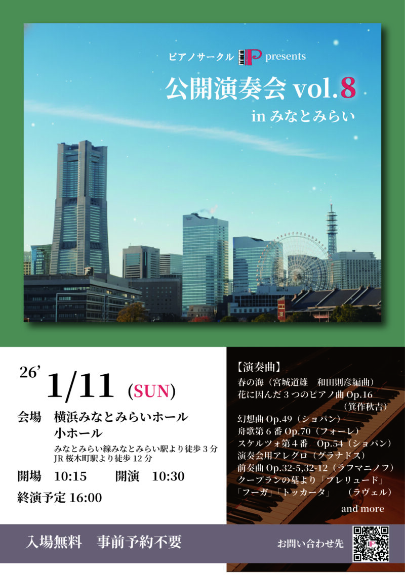 首都圏を中心に活動する社会人サークル「ピアノサークルP」の公開演奏会です。新春らしい「春の海」、ショパンの名曲の数々、ラヴェルの難曲「スカルボ」など幅広い演奏をお楽しみいただけます。