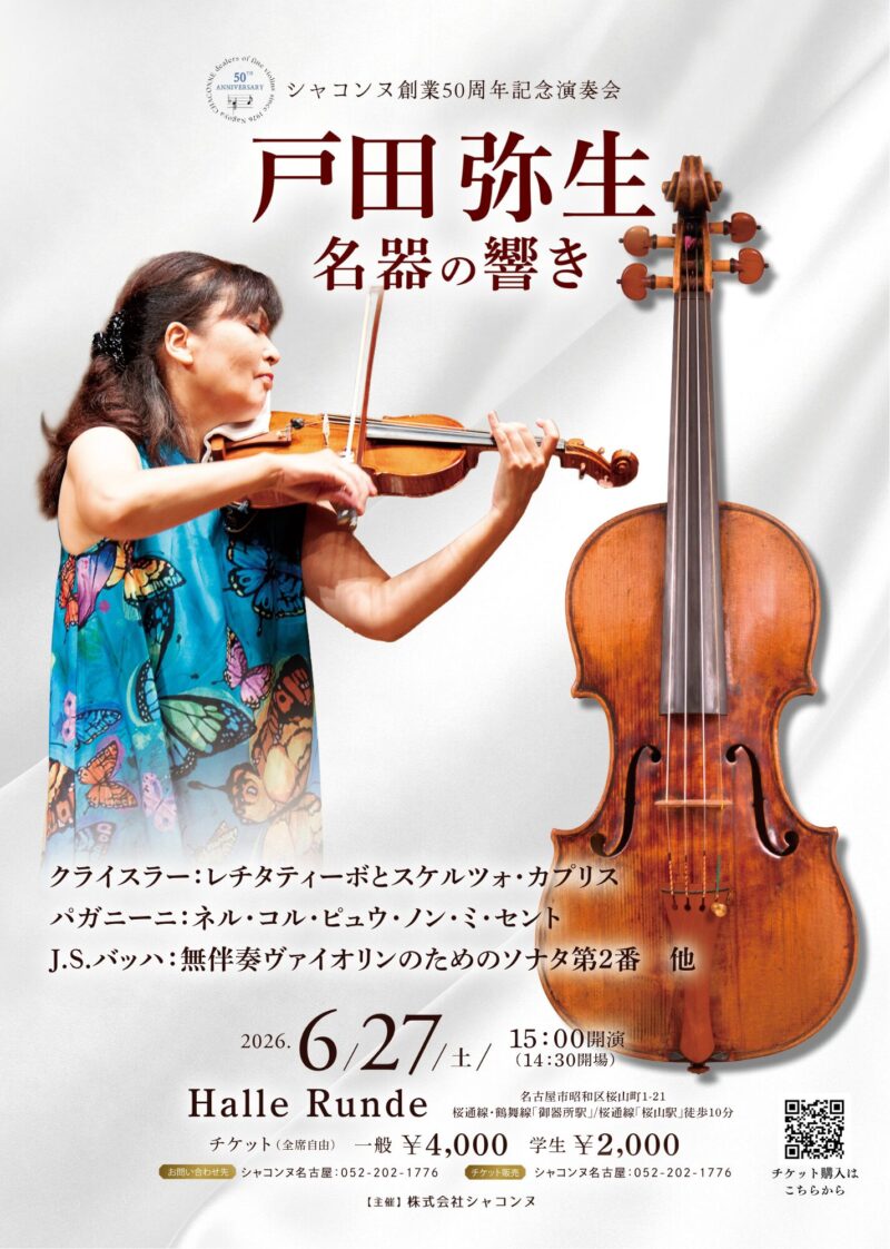 シャコンヌ創立50周年記念CD「名器の響き-The Sound of Maestros-」からクライスラーやパガニーニの名曲、そして「J.S.Bach:無伴奏ヴァイオリンのためのパルティータ第2番より シャコンヌ」等を名器で演奏いたします。
